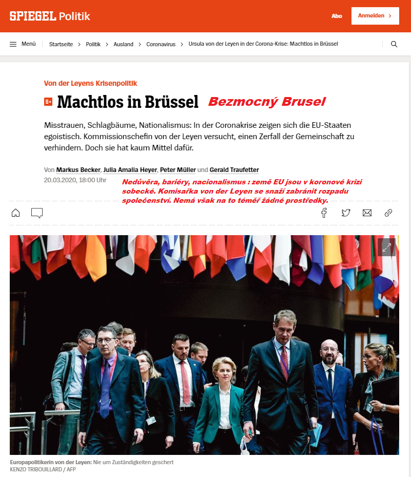 Printscreen z internetového vydání německého deníku Der Spiegel 21.března 2020 (červeně doplněn překlad) :
