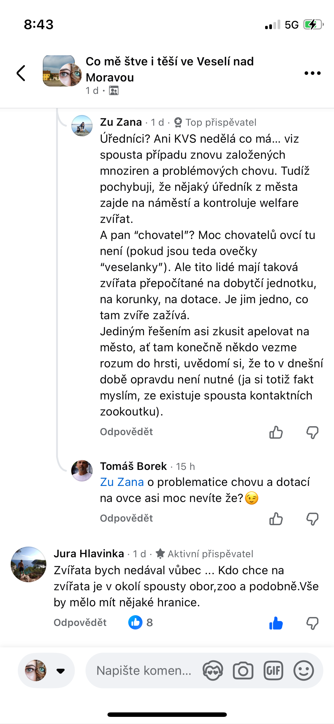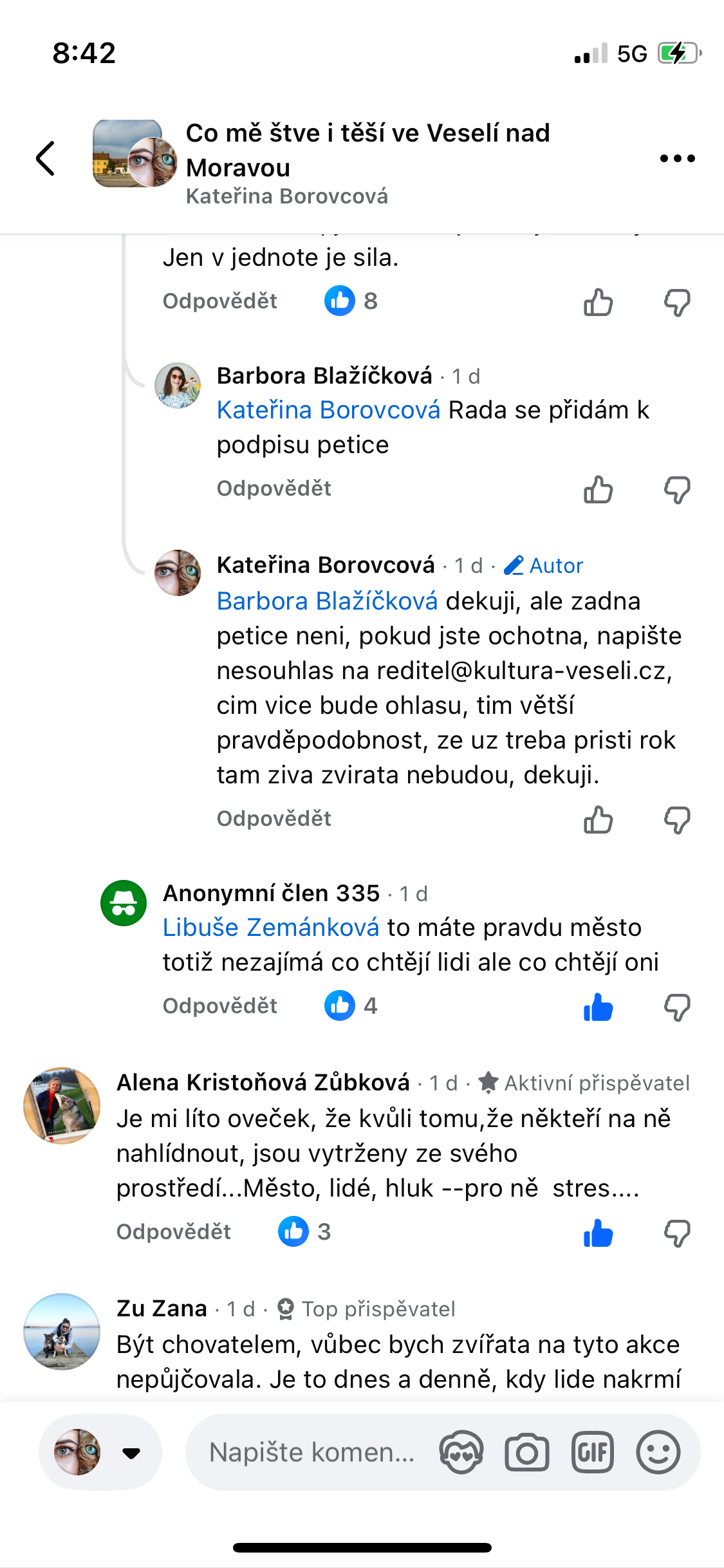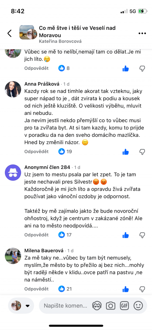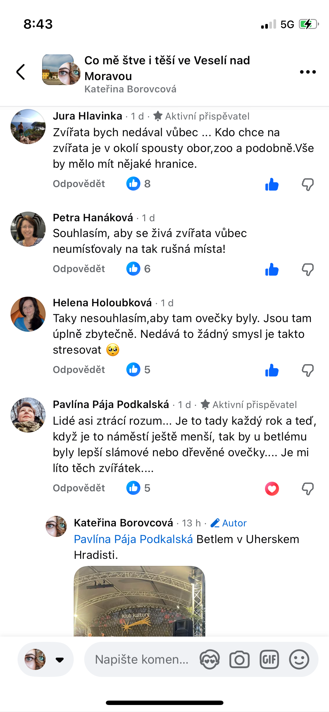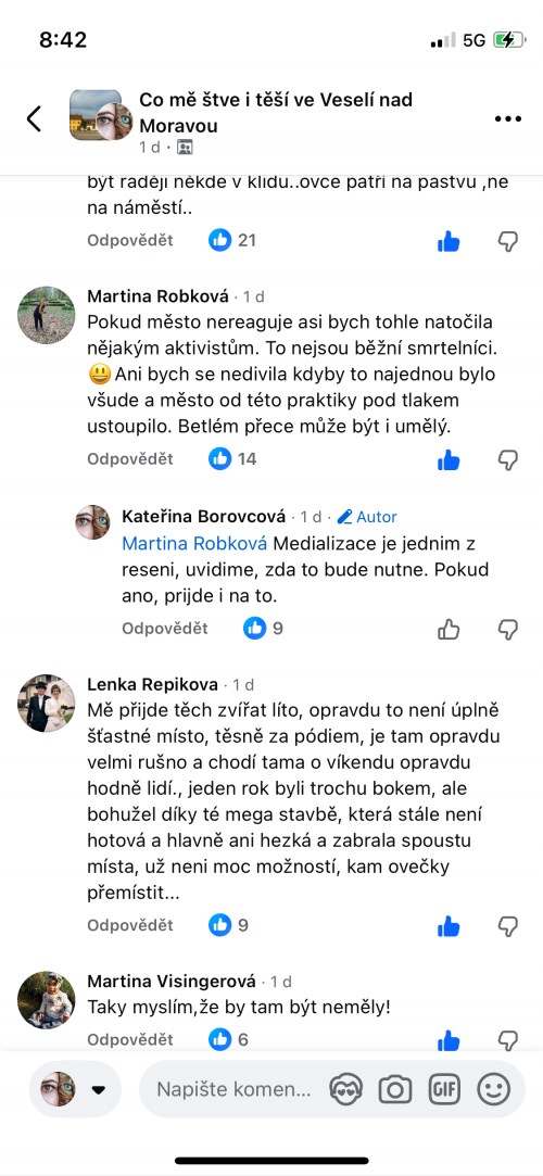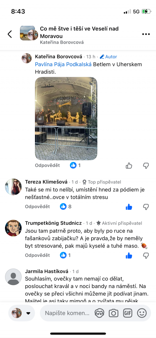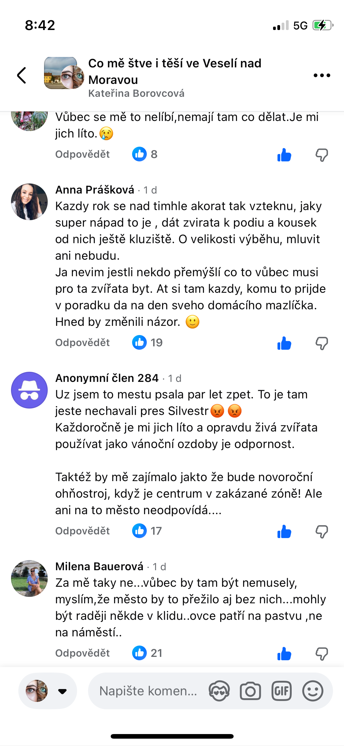 Nevím jak toto zdůvodnění důstojně okomentovat ... bydlím nedaleko náměstí a při koncertech je v centru takový hluk, že musíme mít všechna okna zavřená, jinak se doma neslyšíme. Podle pana ředitele je ale za podiem asi nějaká pohádková zvuková bublina, ve které si ovce užívají klidu jako v lázních. Vytvořila jsem tedy na fb skupině Co mě štve i těší ve Veselí nad Moravou příspěvek s výzvou, aby se zde občané mohli k věci vyjádřit, včetně pana ředitele. Sešlo se tu už přes stovku komentujících a lajkujících občanů, kteří nesouhlasí s umisťováním živých zvířat na náměstí obecně, natož na tak nevhodném místě. Proto jsem zkusila znovu napsat panu řediteli - na jeho vyjádření doposud čekám, ale nevěřím v nějaký pozitivní posun pro ta zvířata. Myslím, že nebudu daleko od pravdy, když vyjádřím svou domněnku, že pan ředitel koná a bude konat na příkaz pana starosty, i kdyby to bylo v rozporu s jeho osobním postojem.