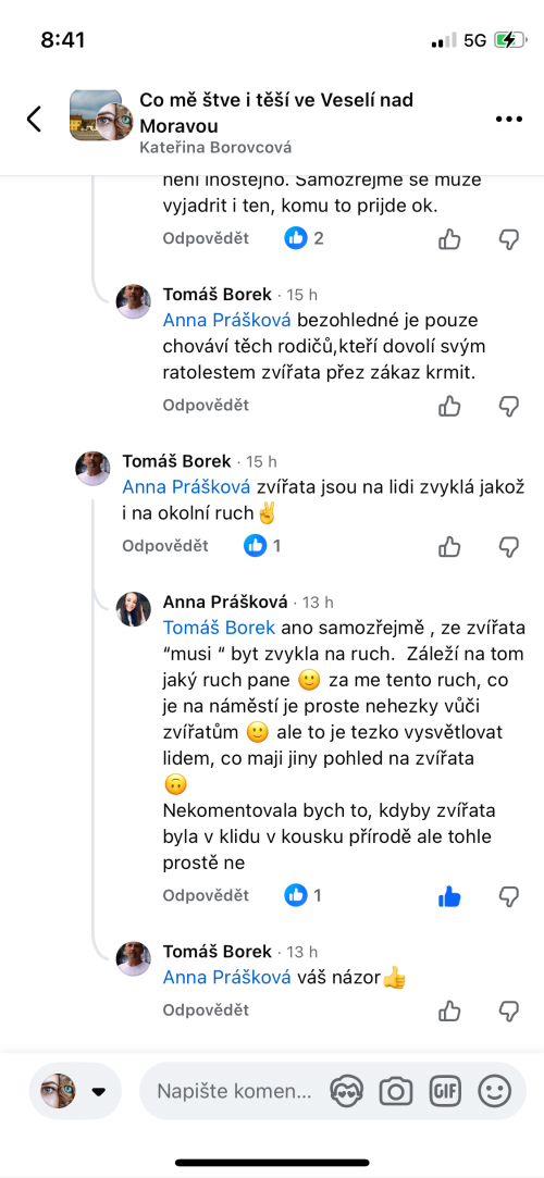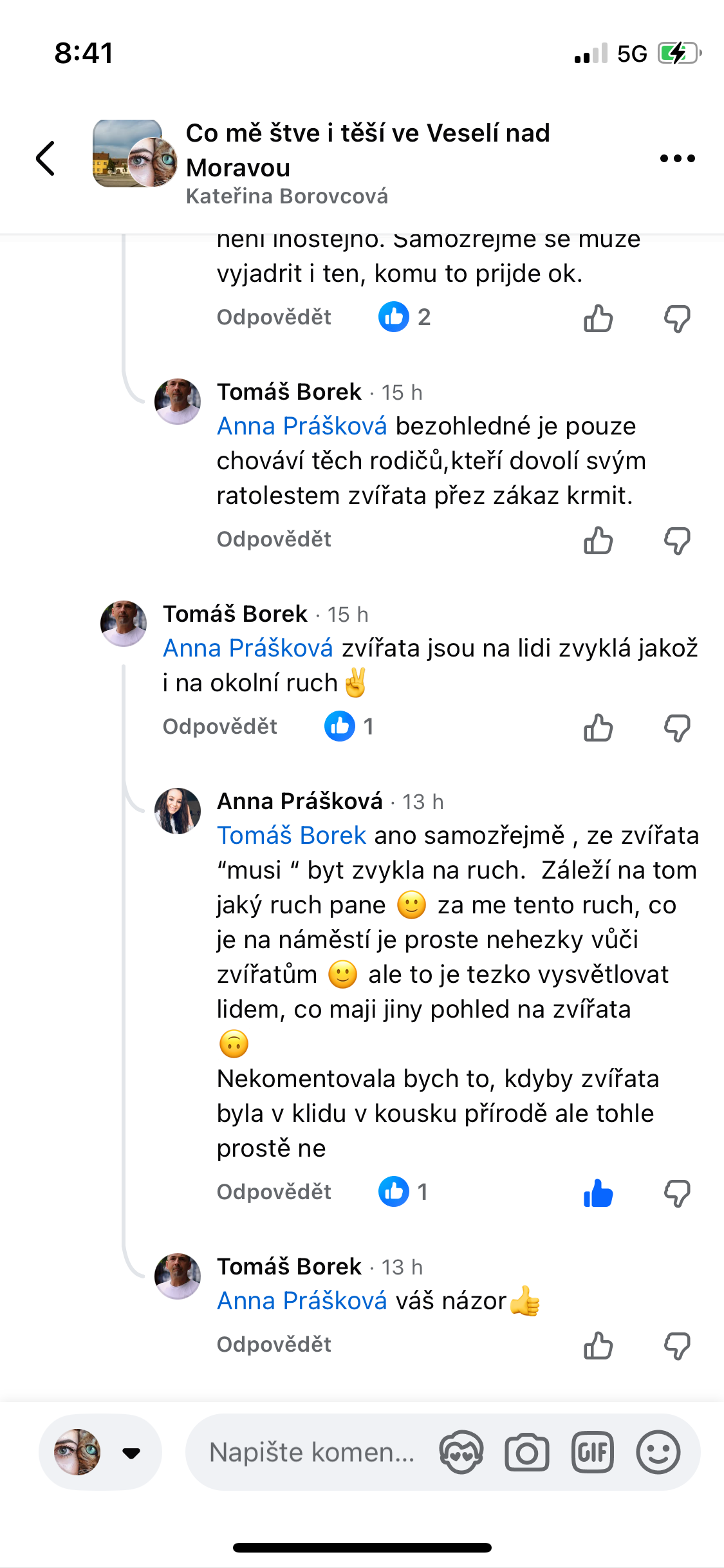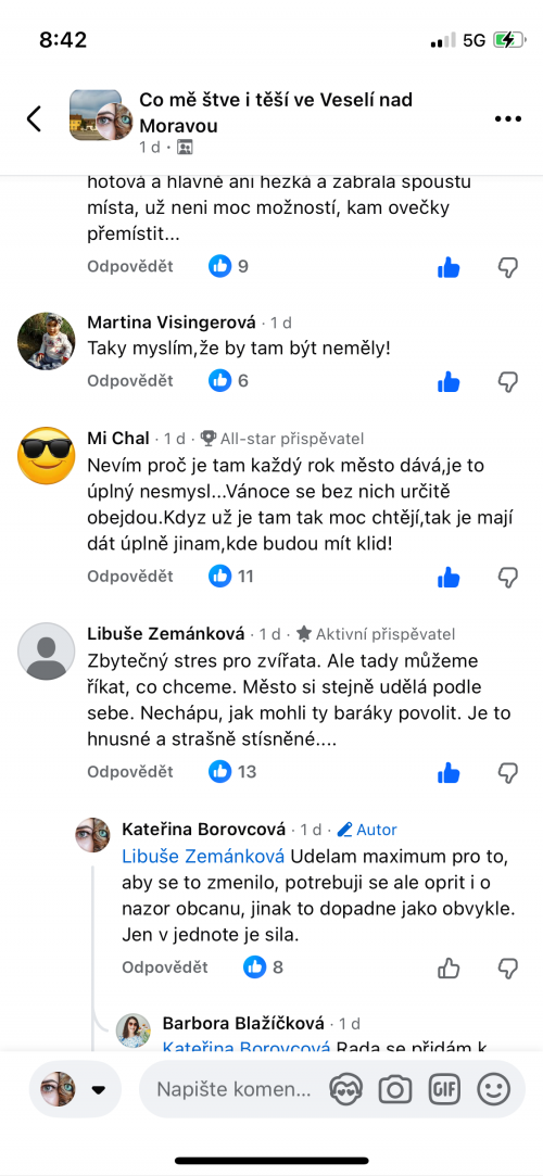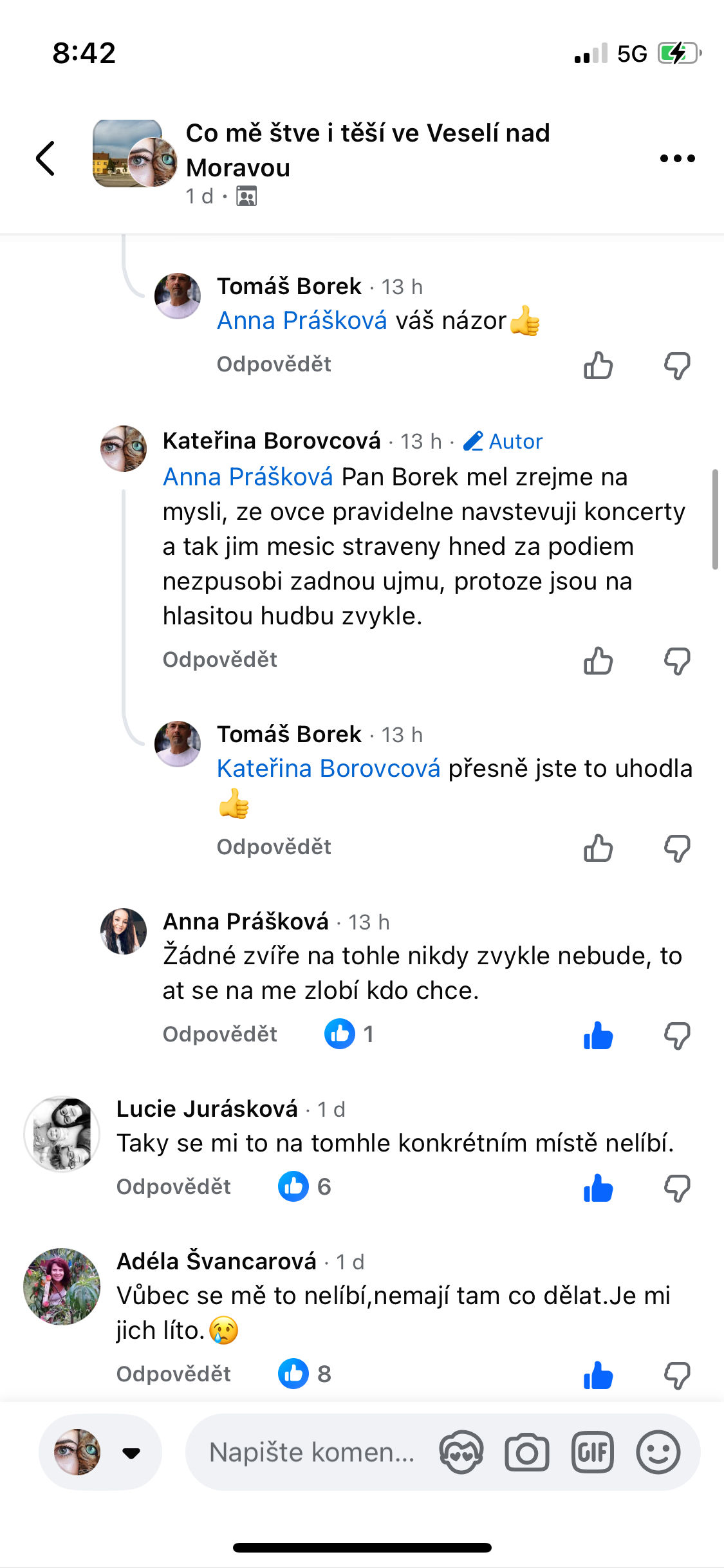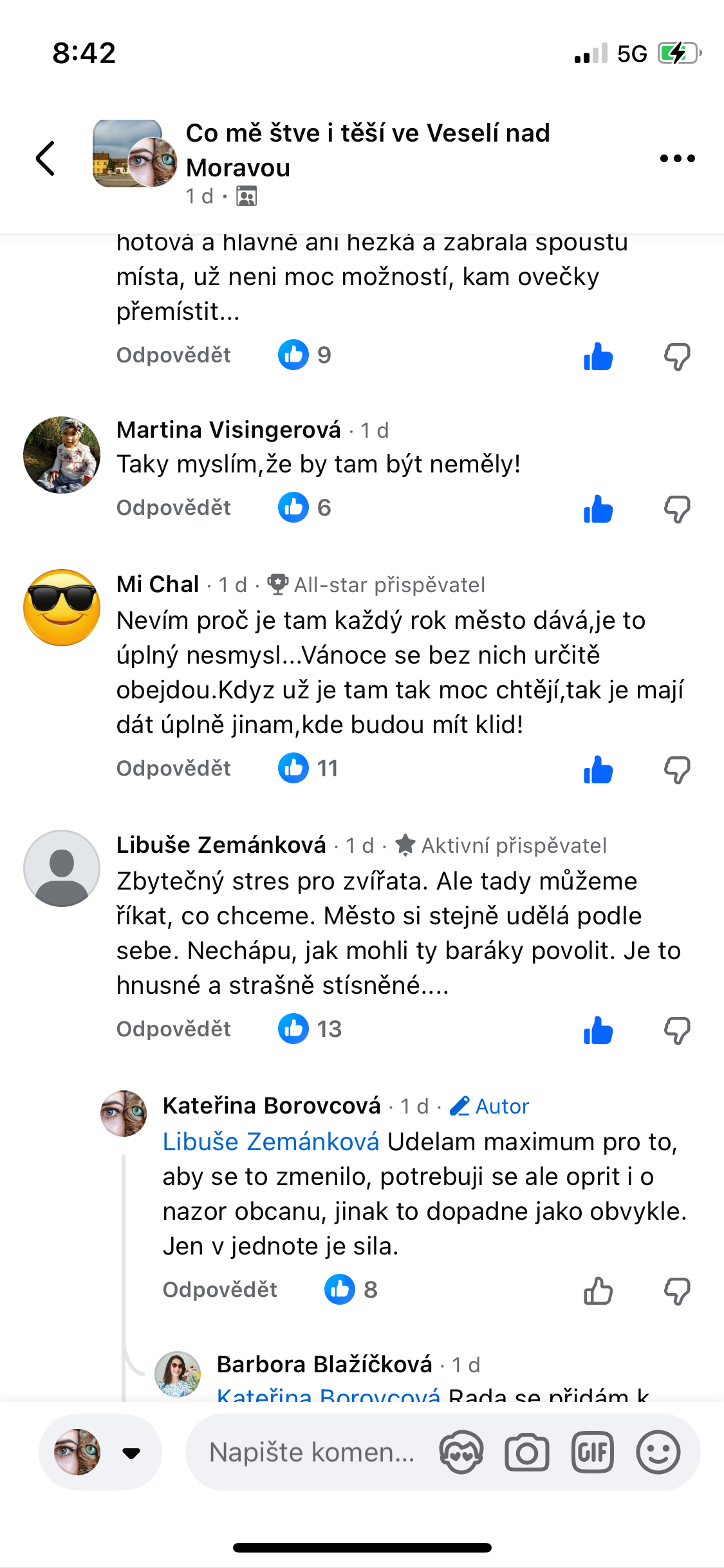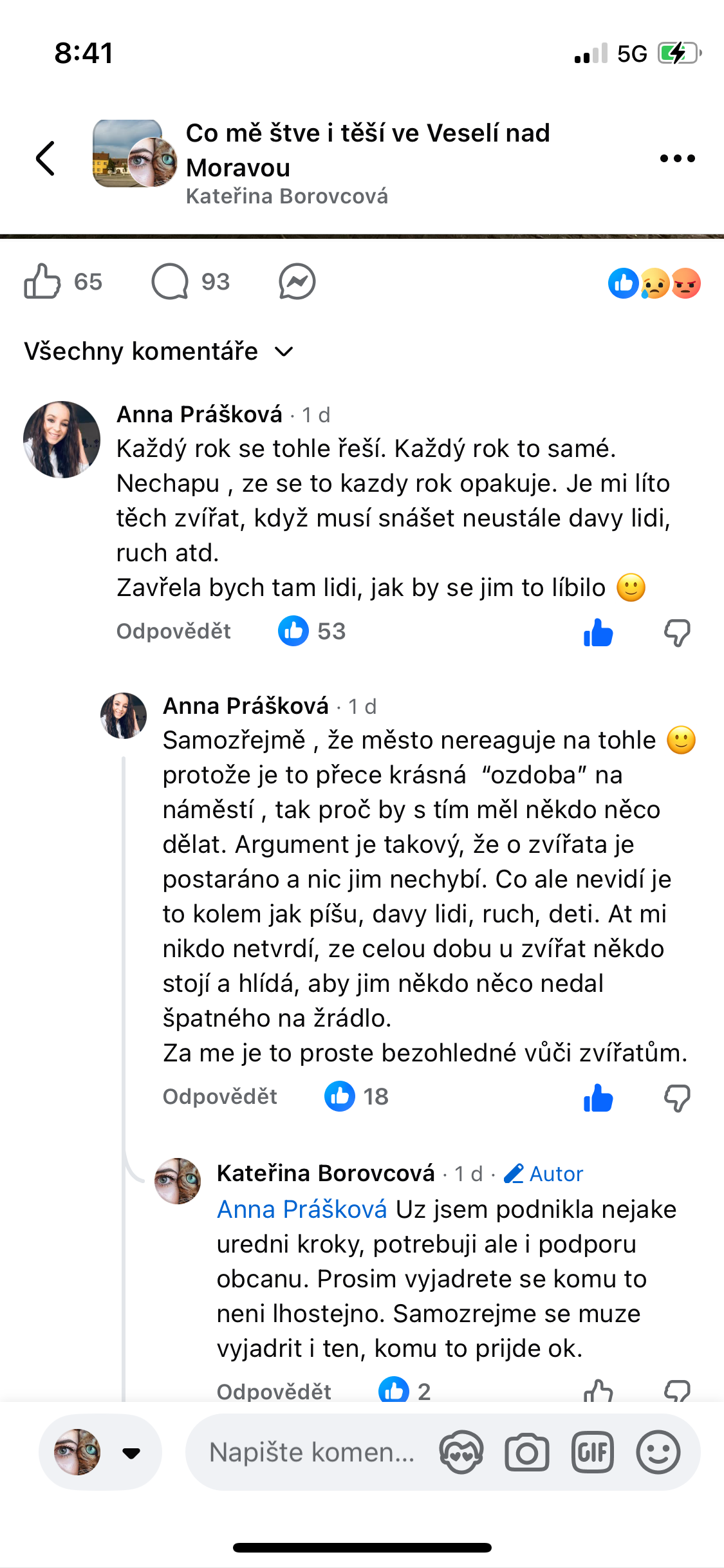 Nevím jak toto zdůvodnění důstojně okomentovat ... bydlím nedaleko náměstí a při koncertech je v centru takový hluk, že musíme mít všechna okna zavřená, jinak se doma neslyšíme. Podle pana ředitele je ale za podiem asi nějaká pohádková zvuková bublina, ve které si ovce užívají klidu jako v lázních. Vytvořila jsem tedy na fb skupině Co mě štve i těší ve Veselí nad Moravou příspěvek s výzvou, aby se zde občané mohli k věci vyjádřit, včetně pana ředitele. Sešlo se tu už přes stovku komentujících a lajkujících občanů, kteří nesouhlasí s umisťováním živých zvířat na náměstí obecně, natož na tak nevhodném místě. Proto jsem zkusila znovu napsat panu řediteli - na jeho vyjádření doposud čekám, ale nevěřím v nějaký pozitivní posun pro ta zvířata. Myslím, že nebudu daleko od pravdy, když vyjádřím svou domněnku, že pan ředitel koná a bude konat na příkaz pana starosty, i kdyby to bylo v rozporu s jeho osobním postojem.